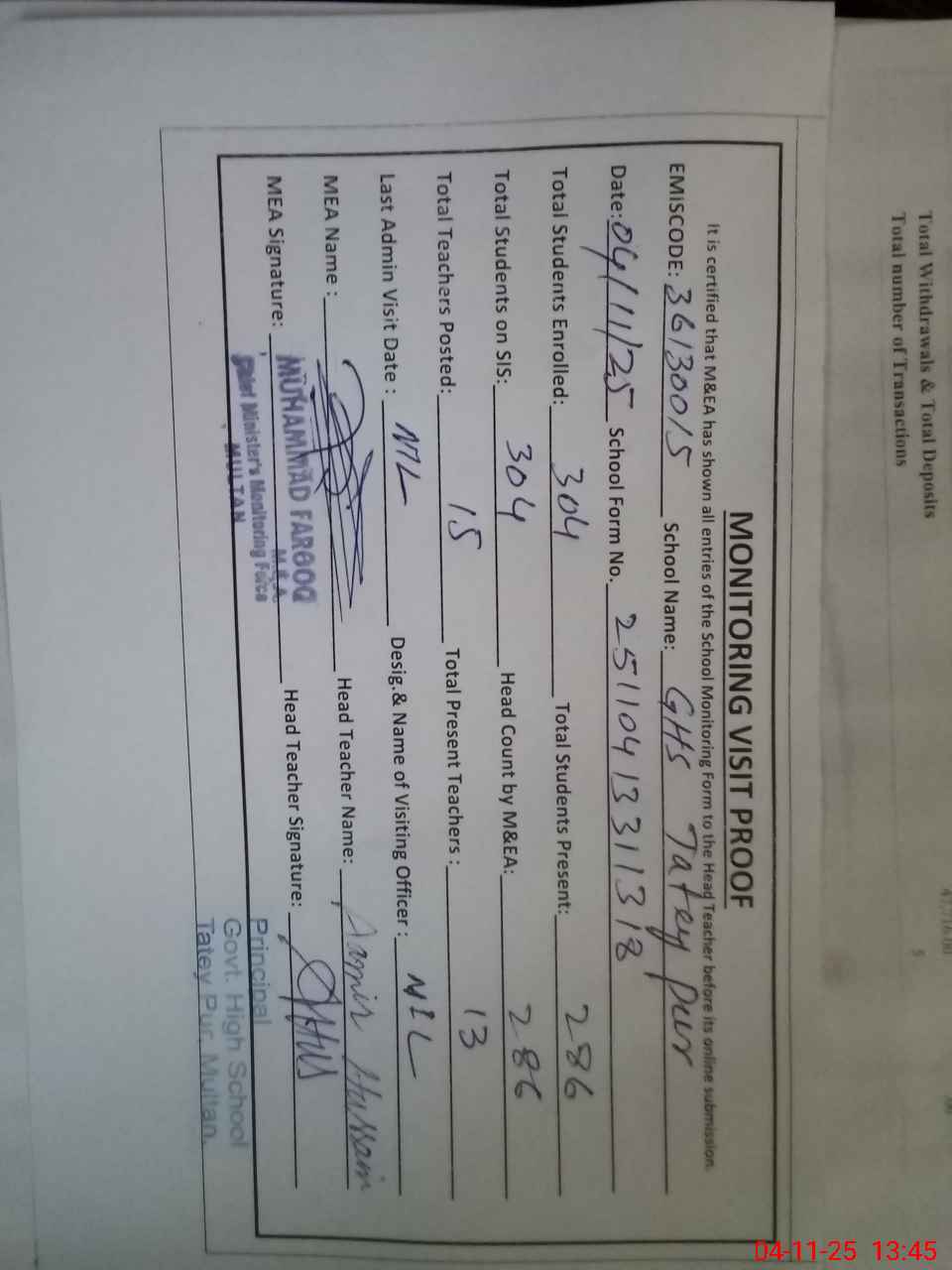 | EMIS Code: 36130015 | Name of School: GHS TATEY PUR MULTAN MAUZA TATEY PUR | |||