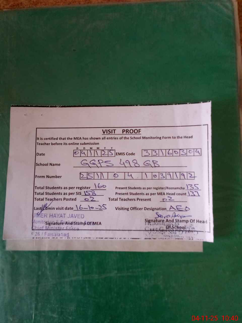 | EMIS Code: 33160304 | Name of School: GGPS CHAK 498 GB MAMUNKANJAN | |||