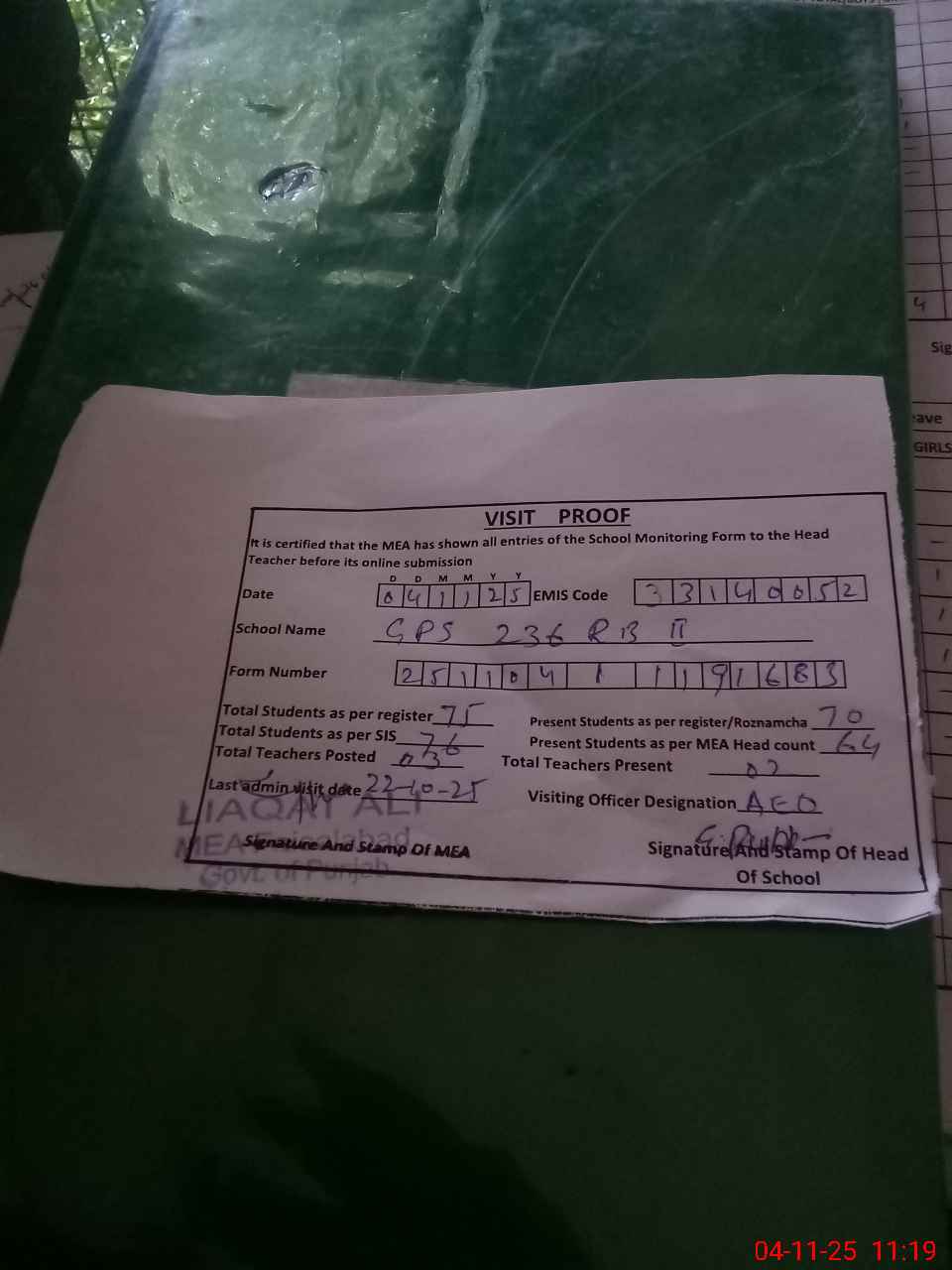 | Attendance Register | Head Teacher | MEA with School | Visit Proof |