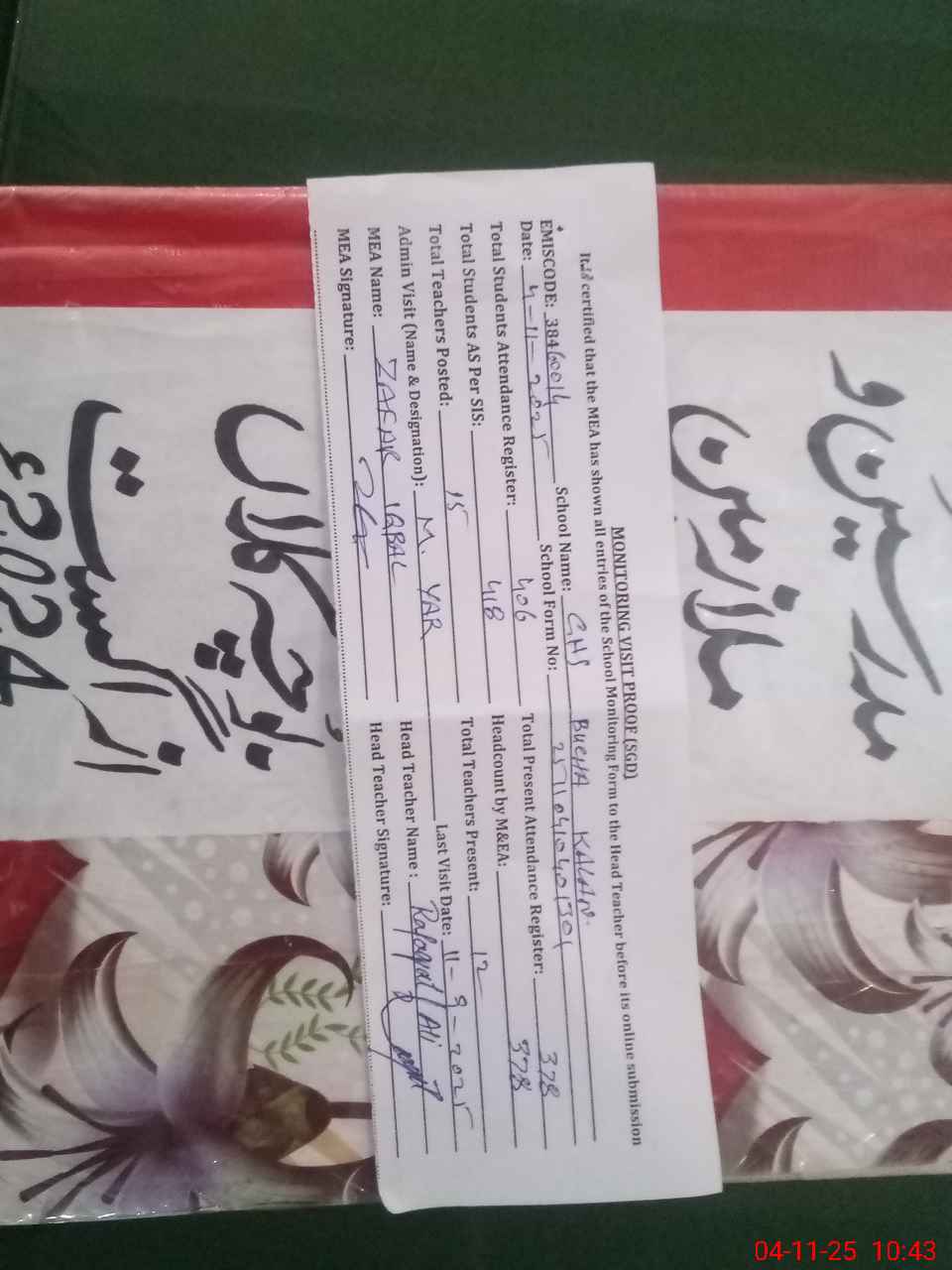 | Attendance Register | Head Teacher | MEA with School | Visit Proof |