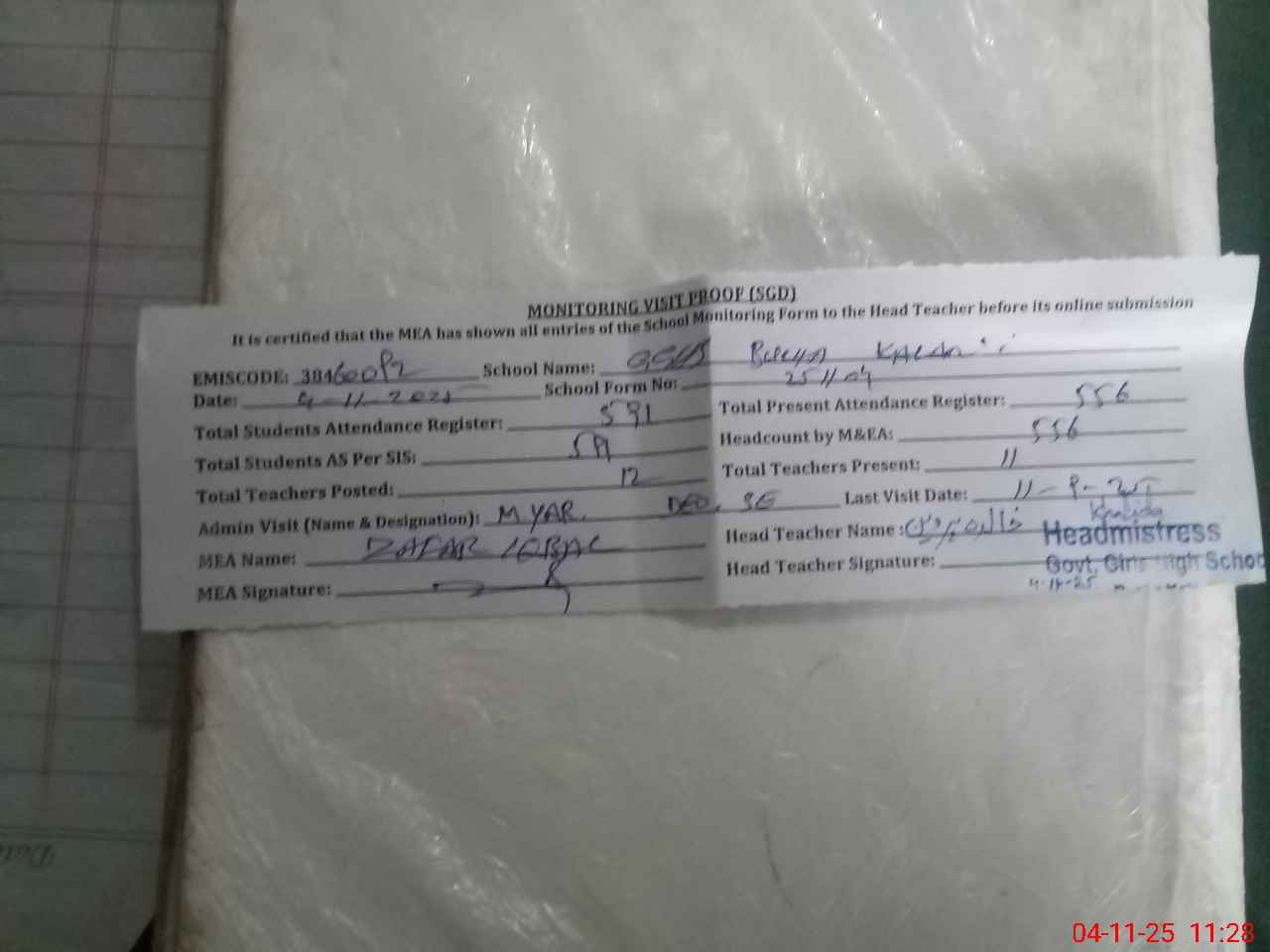 | Attendance Register | Head Teacher | MEA with School | Visit Proof |