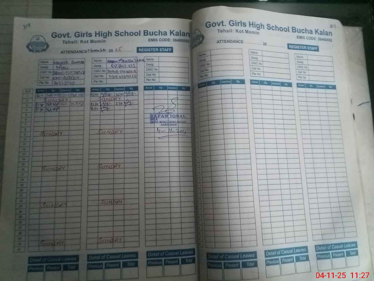 | Monitoring Date: 04-11-2025 | Start Time: 04-11-2025 10:55 AM | End Time: 04-11-2025 11:28 AM | Name of MEA: ZA**** IQ**** | |
