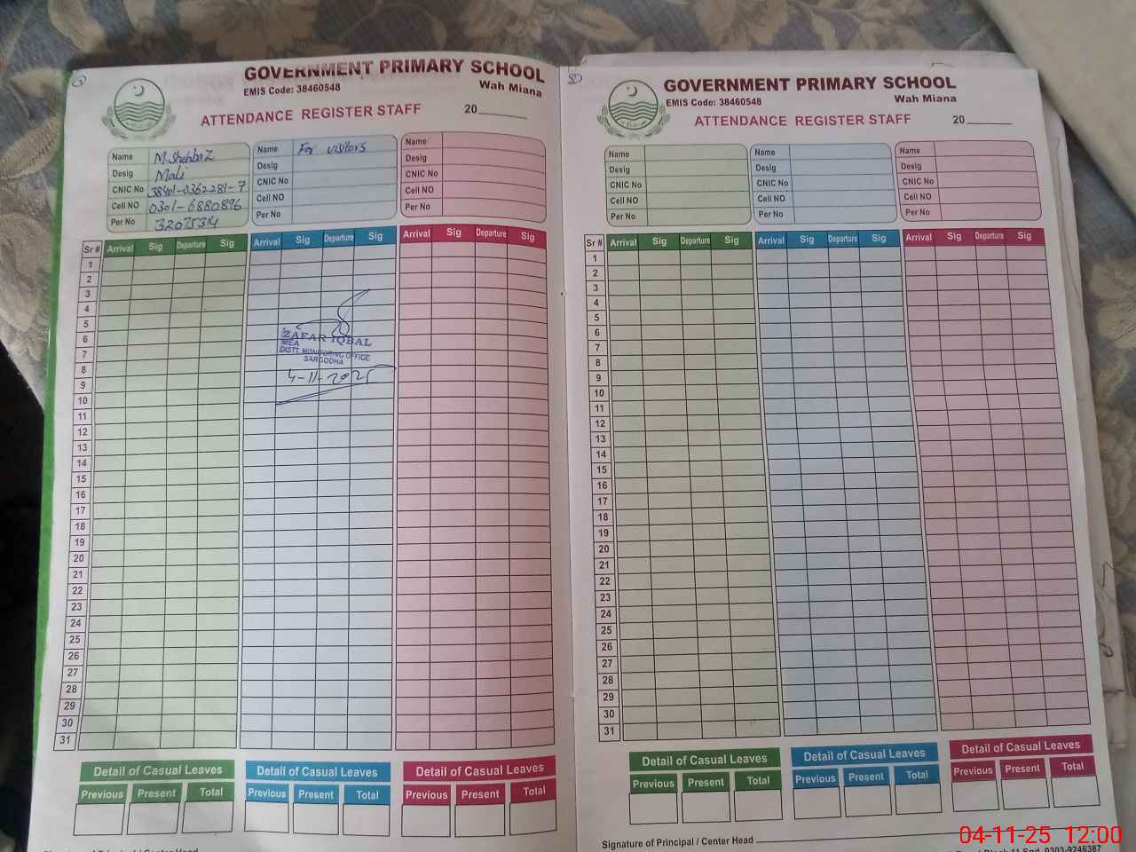 | CNIC | Full Name | Designation | R/C | Absence During Last Calender Month |