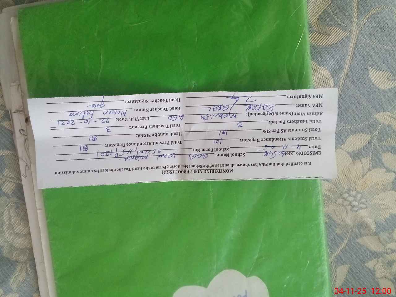 | Attendance Register | Head Teacher | MEA with School | Visit Proof |