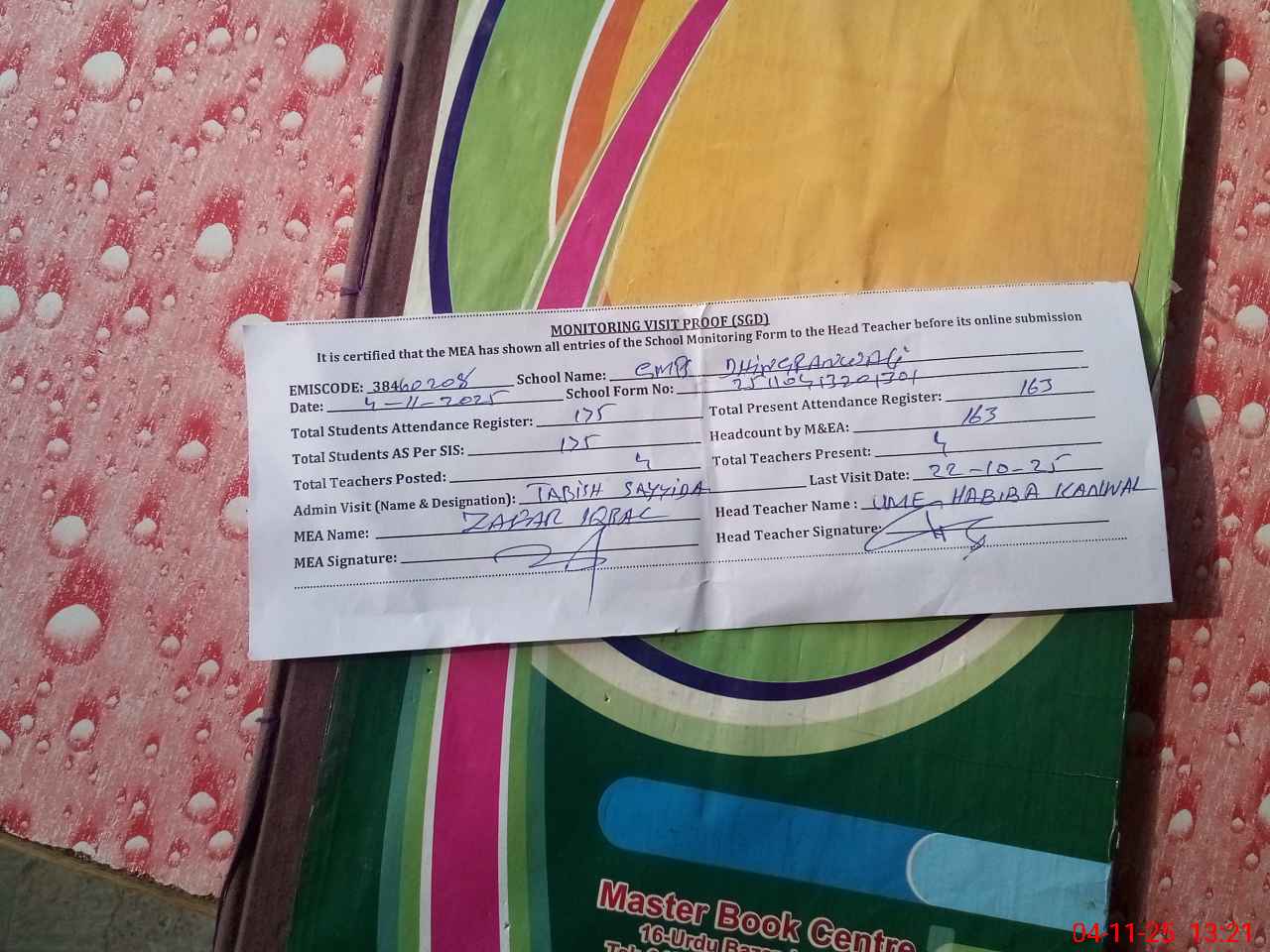 | Attendance Register | Head Teacher | MEA with School | Visit Proof |