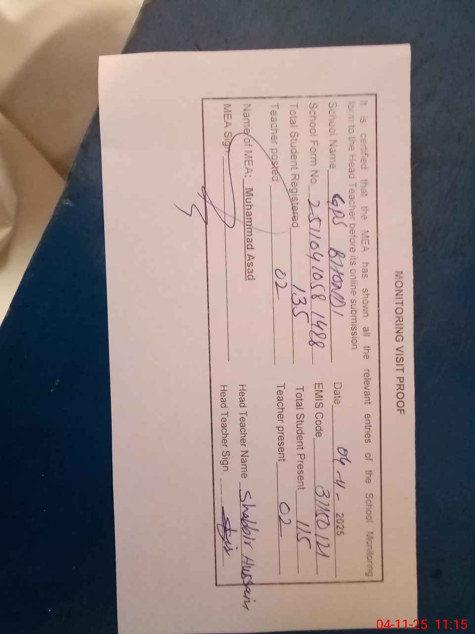 | Attendance Register | Head Teacher | MEA with School | Visit Proof |