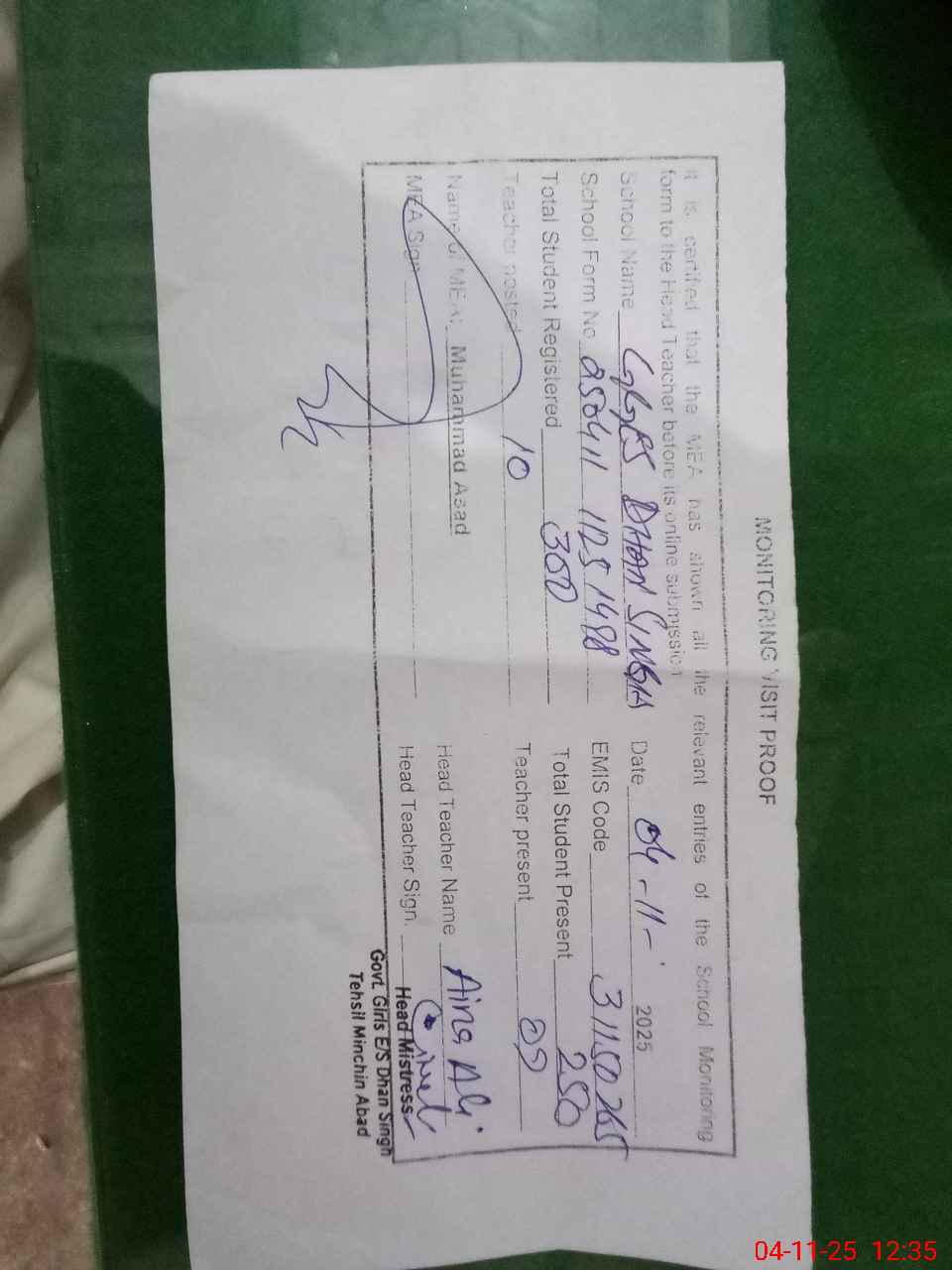| Certified that this School was Inspected by the Undersigned MEA/DMO Today and the Information Stated Above is as Per Record. | |||||