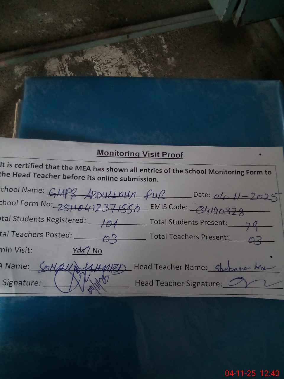 | Attendance Register | Head Teacher | MEA with School | Visit Proof |