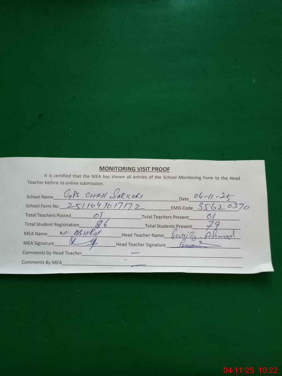 | Attendance Register | Head Teacher | MEA with School | Visit Proof |