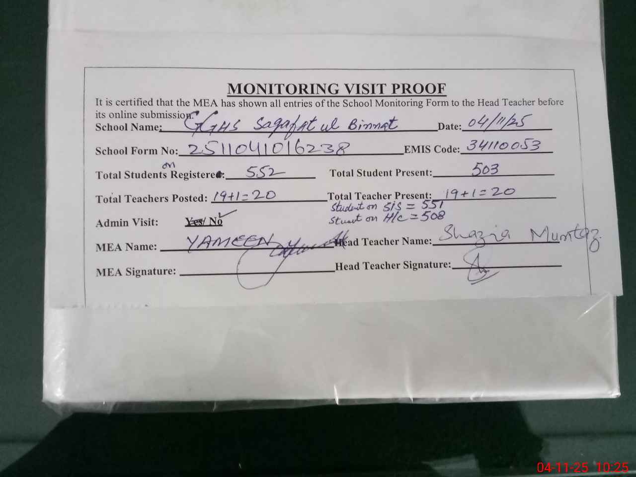 | EMIS Code: 34110053 | Name of School: GGHS SAQAFAT UL BINNAT | |||