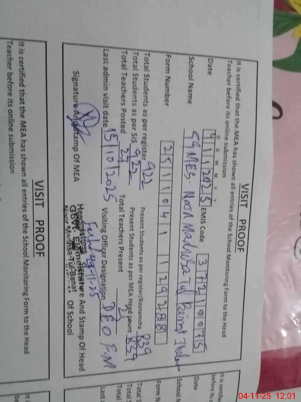 | EMIS Code: 37210075 | Name of School: GGMES NOOR MADRISA TUL BINAT JHELUM | |||