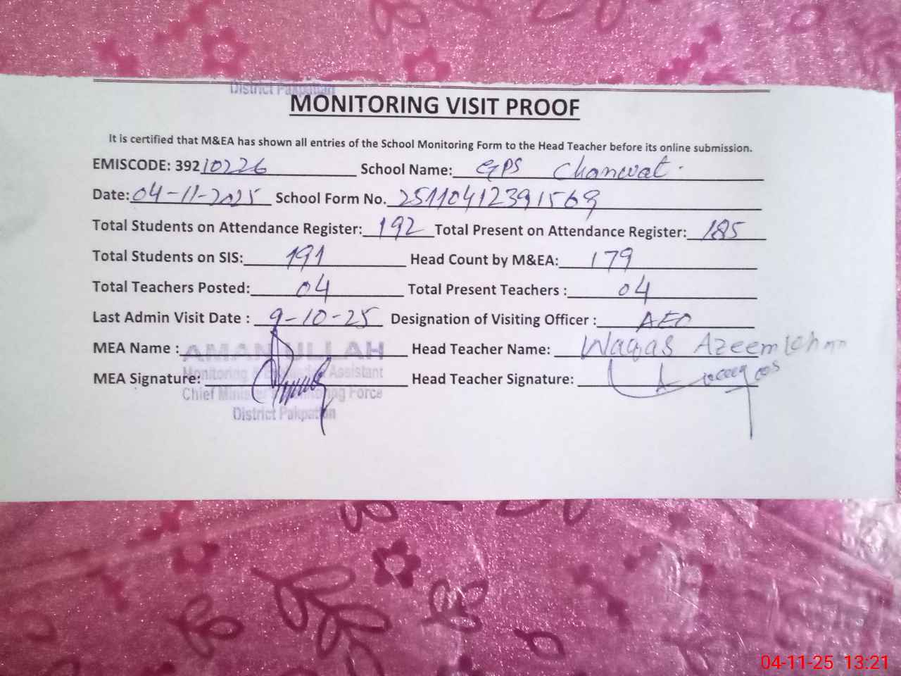 | Attendance Register | Head Teacher | MEA with School | Visit Proof |