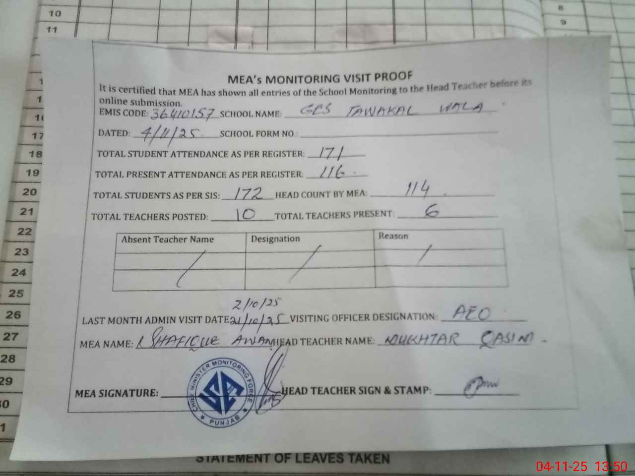 | EMIS Code: 36410157 | Name of School: GES TAWAKKAL WALA, P/O MOUZA CHAK SHER KHAN, KABIRWALA | |||