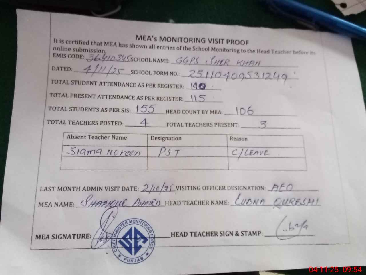 | Monitoring Date: 04-11-2025 | Start Time: 04-11-2025 08:54 AM | End Time: 04-11-2025 10:03 AM | Name of MEA: SH**** AH**** | |