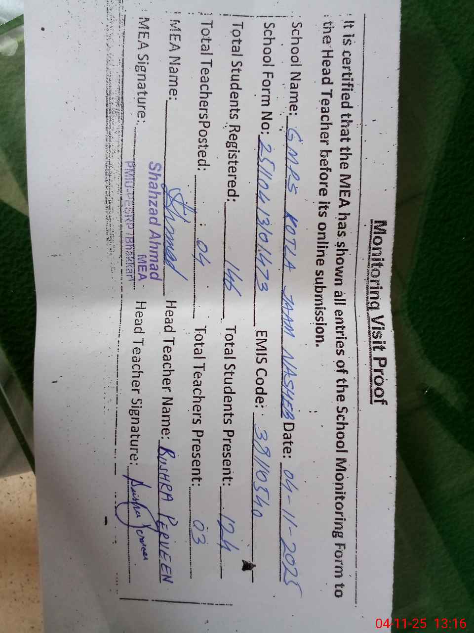 | Attendance Register | Head Teacher | MEA with School | Visit Proof |