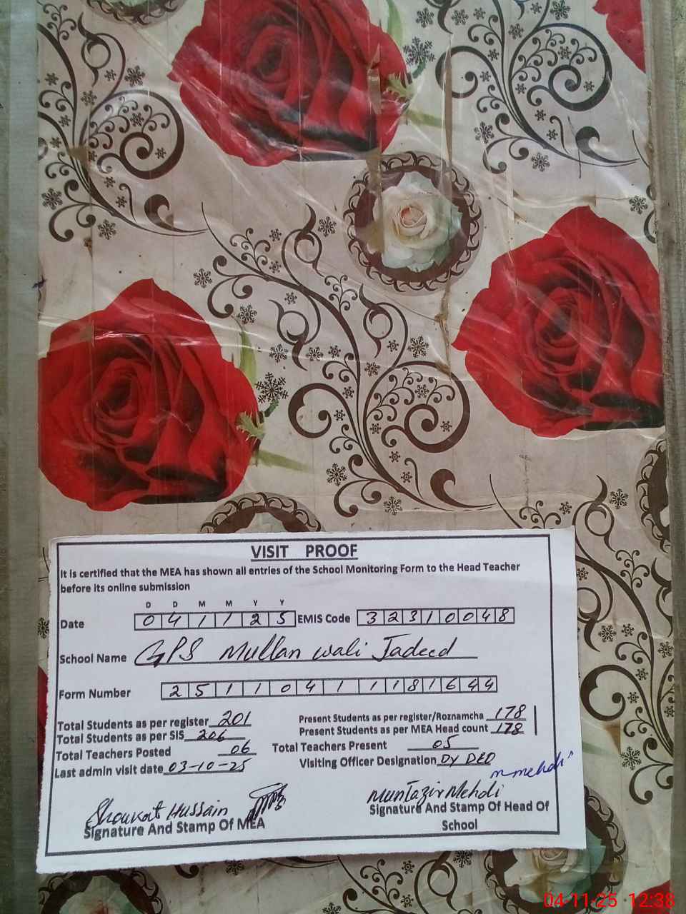 | Certified that this School was Inspected by the Undersigned MEA/DMO Today and the Information Stated Above is as Per Record. | |||||