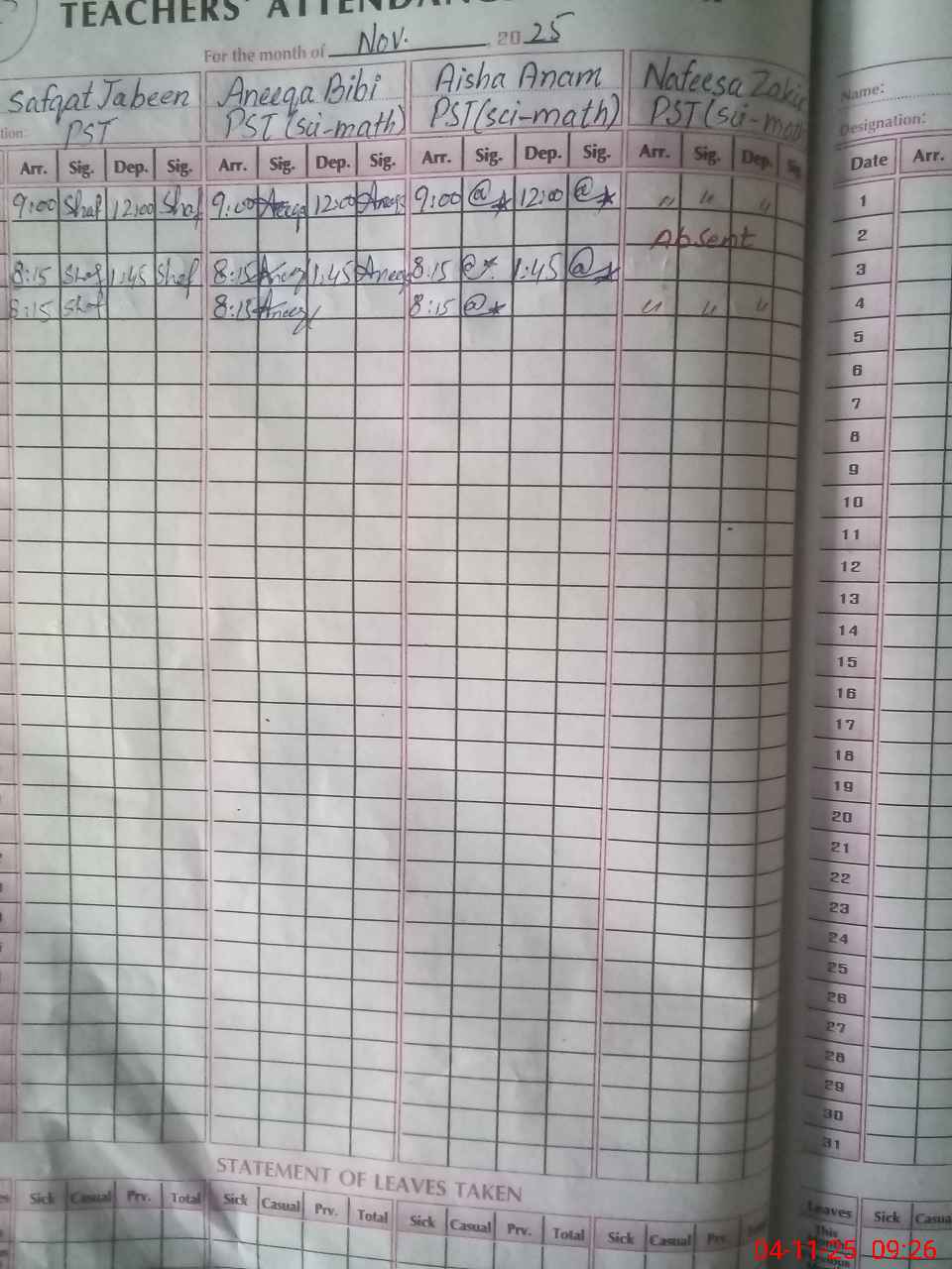 | Remarks (Use Separate Page if Required): Teacher Nafeesa Zakir is absent from school wef from sep 2025 Nsb record is not updated on sis | |||||