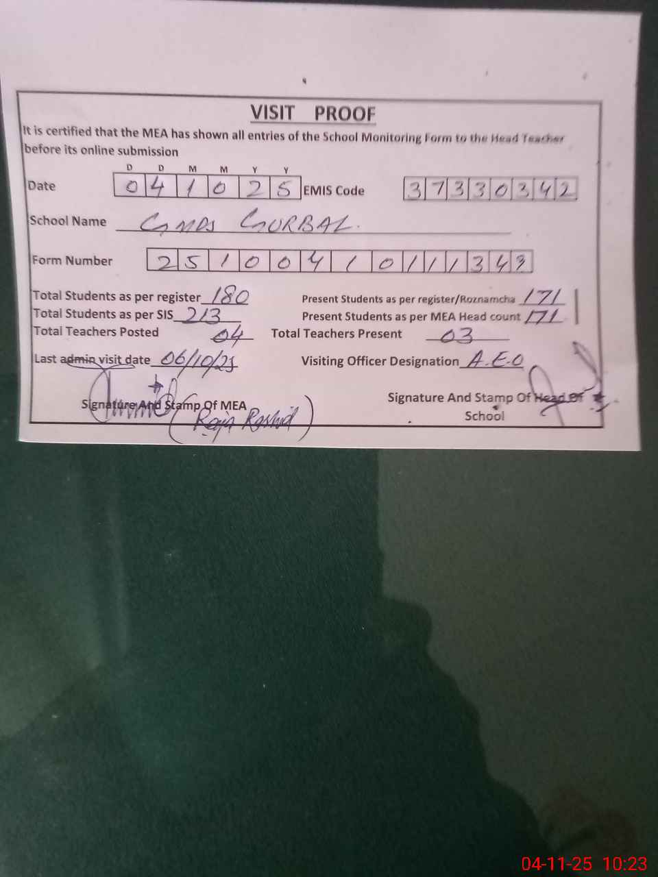 | Attendance Register | Head Teacher | MEA with School | Visit Proof |