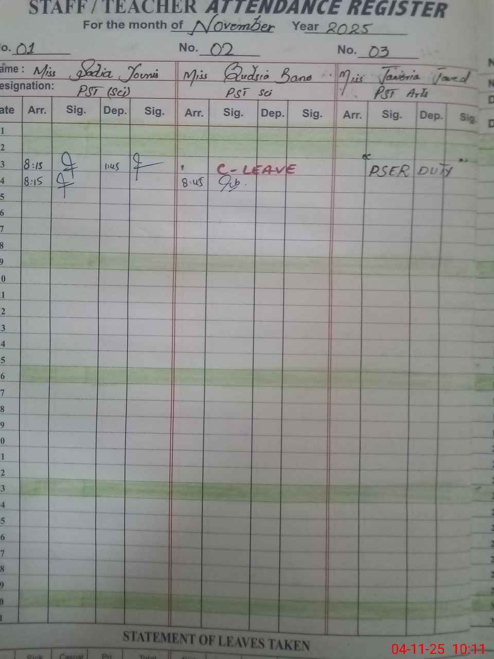 | Leave | Duty | Absent | Maternity | Medical | Ex- Pak |