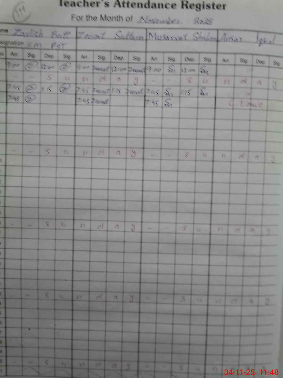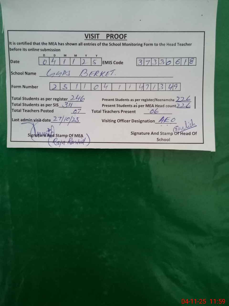 | Remarks (Use Separate Page if Required): Students attendances on attendance register is 246 but on sis students are tagged 311 Head teacher said that 65 students are tagged on sis those are afternoon Taleem project program | |||||