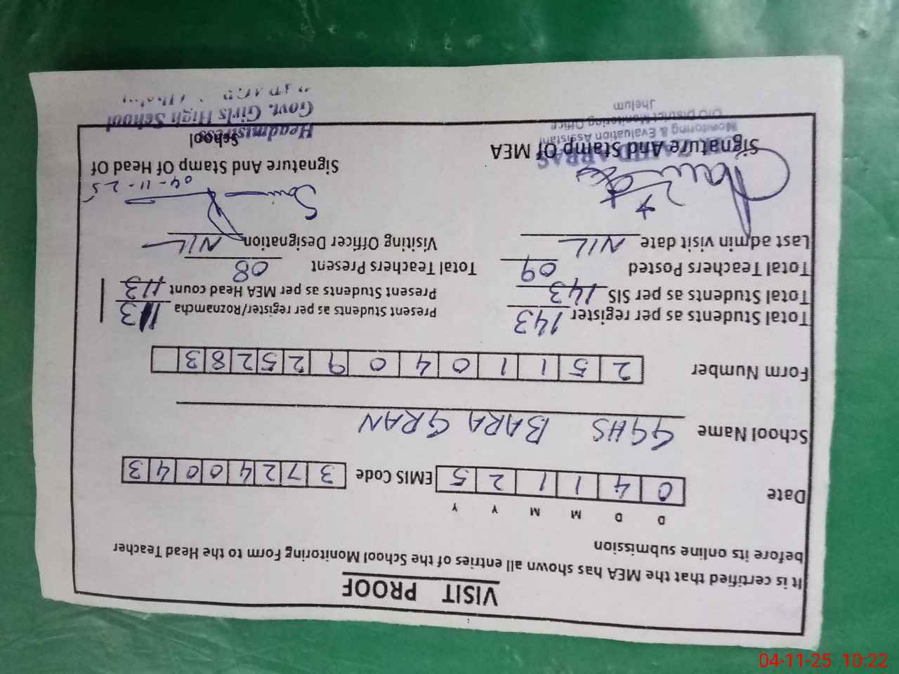 | Attendance Register | Head Teacher | MEA with School | Visit Proof |