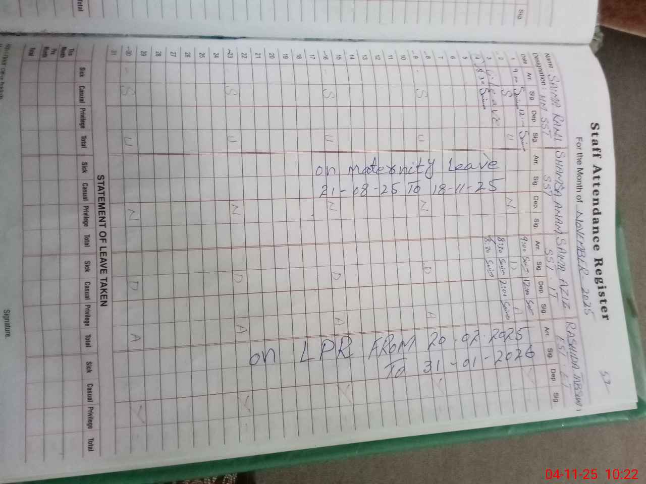 | 37**** | Sh**** An**** | Regular | 31 | 0 | 0 | 31 | 0 | 0 | 0 | 0 | 0 | Maternity | |