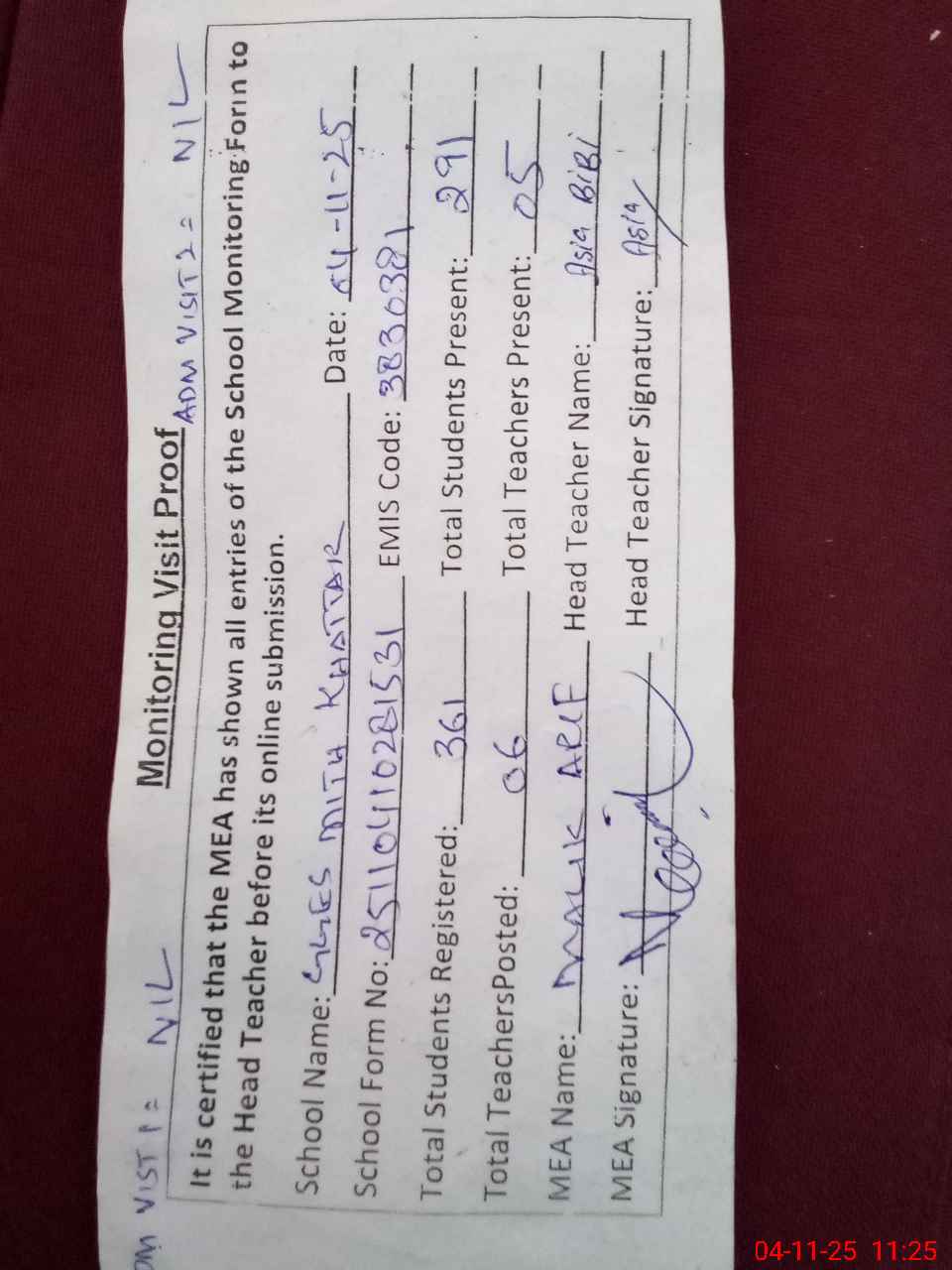 | Attendance Register | Head Teacher | MEA with School | Visit Proof |