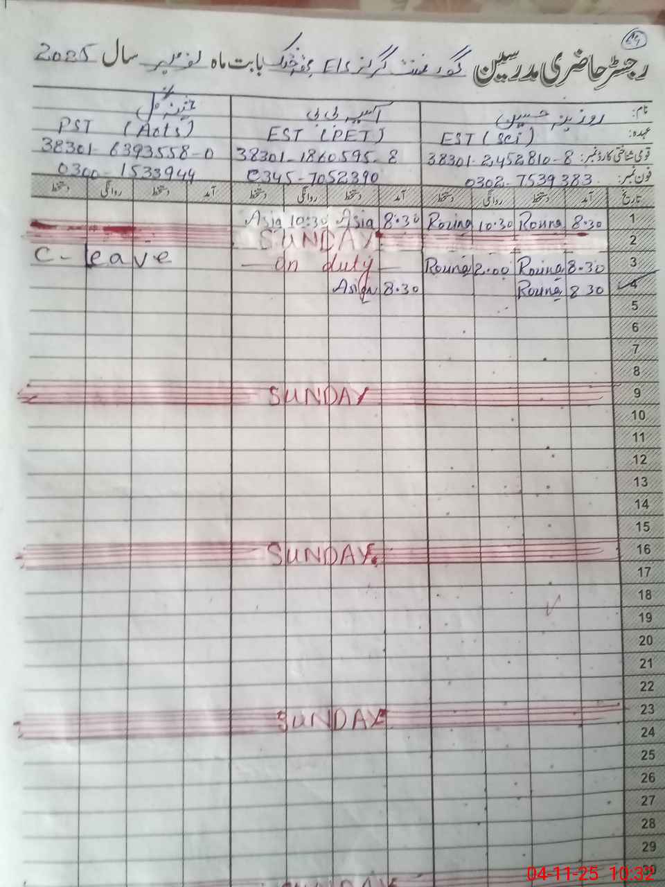 | CNIC | Full Name | Designation | R/C | Absence During Last Calender Month |