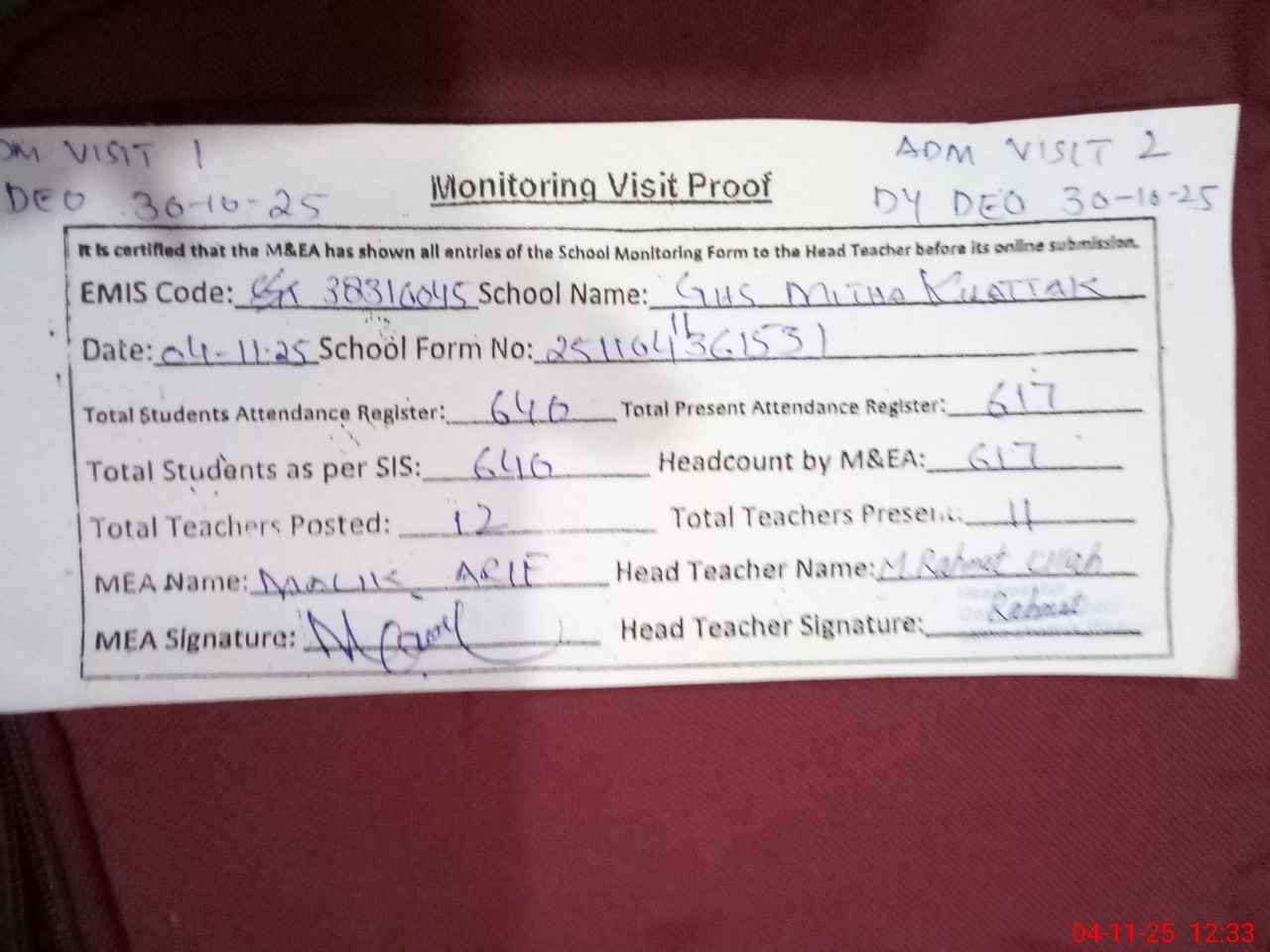 | Attendance Register | Head Teacher | MEA with School | Visit Proof |