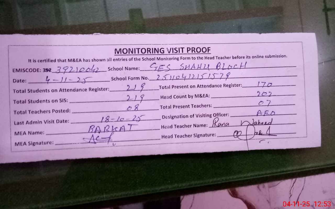 | EMIS Code: 39210042 | Name of School: GES SHAHU BALOUCH PO PAKPATTAN | |||
