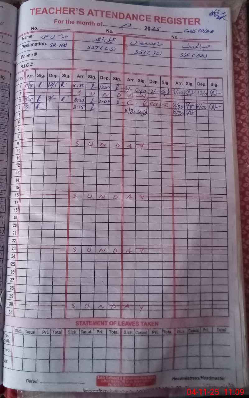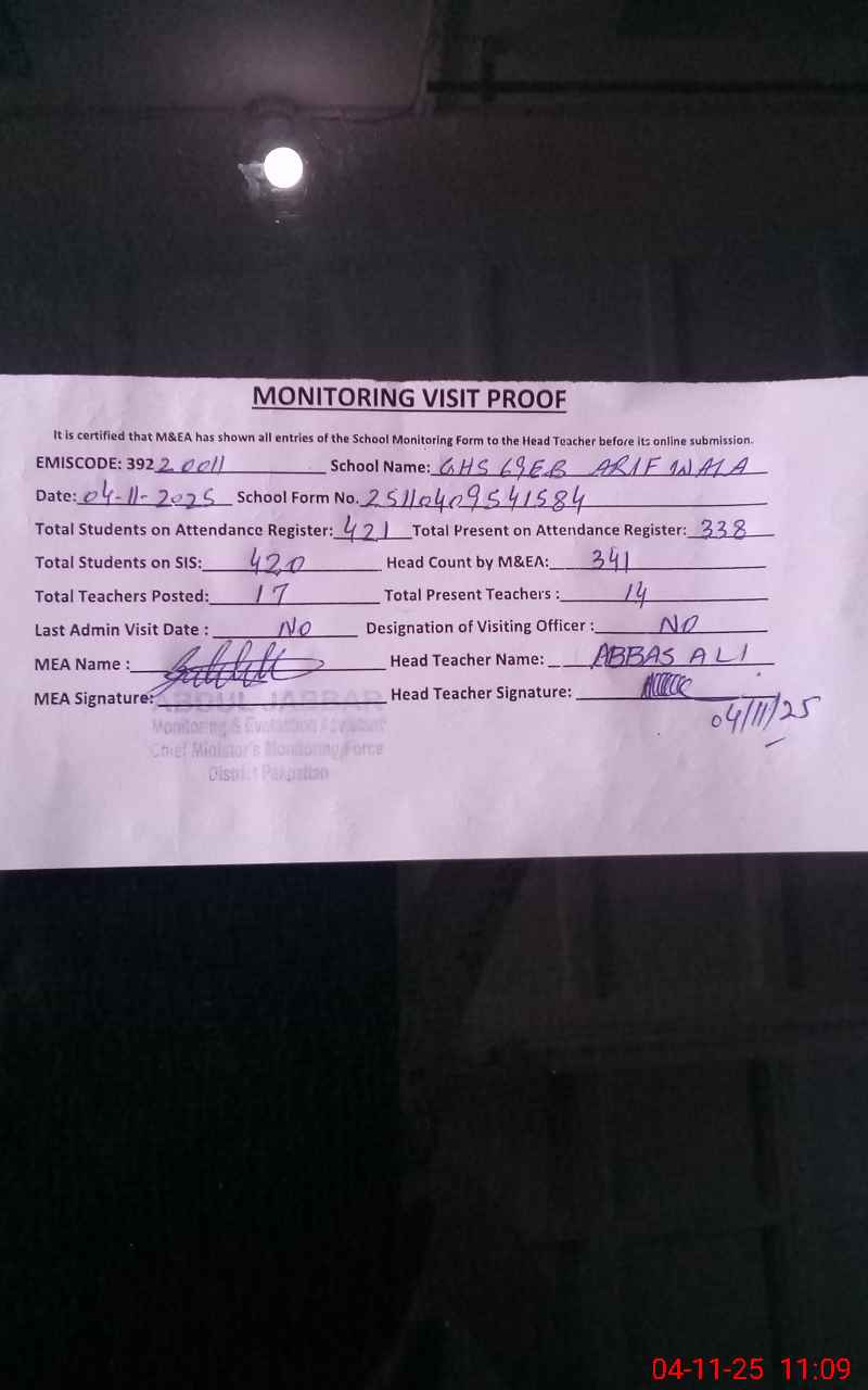 | EMIS Code: 39220011 | Name of School: GHS 69/EB ARIF WALA | |||