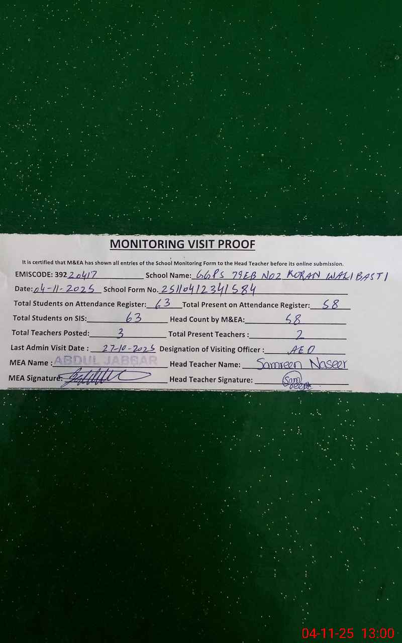 | EMIS Code: 39220417 | Name of School: GGPS 79 / EB NO.2 KORAN WALI BASTI P.O 69 EB | |||