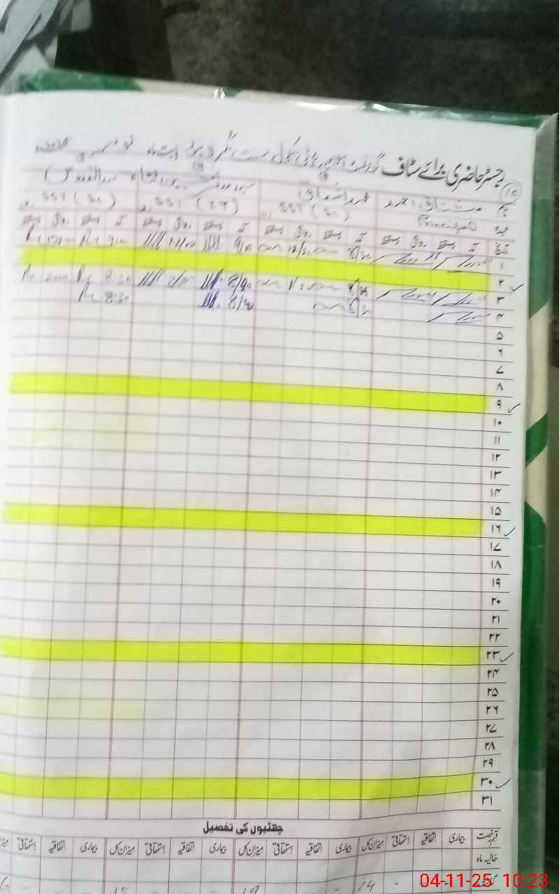 | Remarks (Use Separate Page if Required): Teacher Muhammad Shahzad attached with CEO office M Saleem on LPR since 20 November 2024 showing on teachers list Three teachers are on exame duty and two on casual leave Three classes are with out teachers Class one six and seven received nil sets of books SG Suleman attached with SED and MALI Atta with district election commission office 02 class rooms are declared dangerous and 08 not used for teaching because seems to be dangerous Electric wiring burnt during September and now repaire and maintenance carried out According to the head teacher low student attendance is due to vaccination compaign currently and shortage of staff | |||||