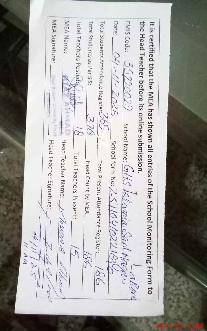 | EMIS Code: 35220029 | Name of School: GHS ISLAMIA SANT NAGAR LAHORE CITY | |||