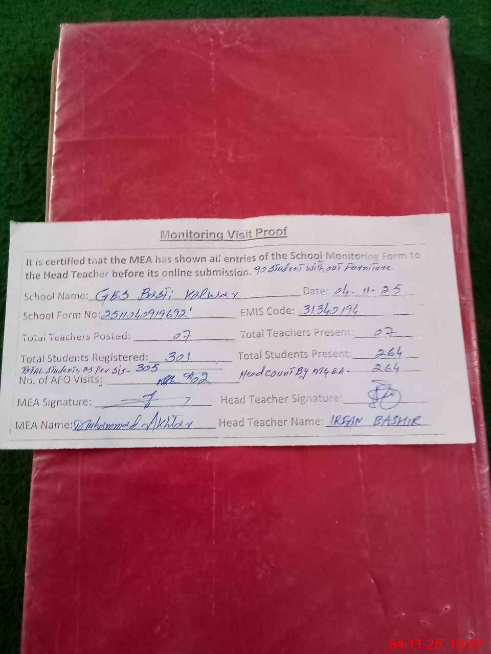 | Attendance Register | Head Teacher | MEA with School | Visit Proof |