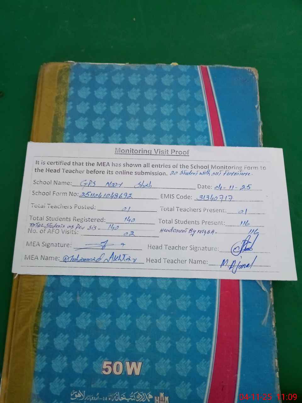 | Attendance Register | Head Teacher | MEA with School | Visit Proof |