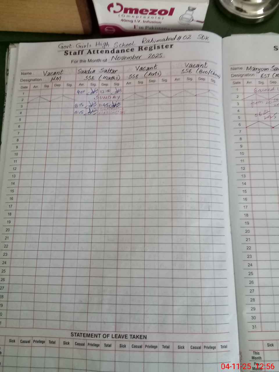 | Leave | Duty | Absent | Maternity | Medical | Ex- Pak |