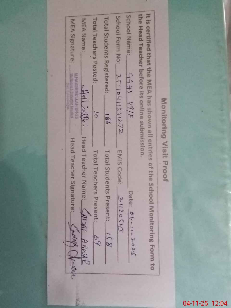 | Attendance Register | Head Teacher | MEA with School | Visit Proof |
