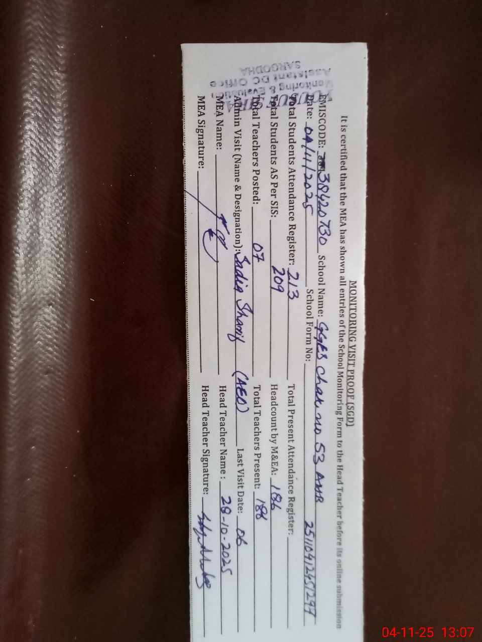 | Attendance Register | Head Teacher | MEA with School | Visit Proof |