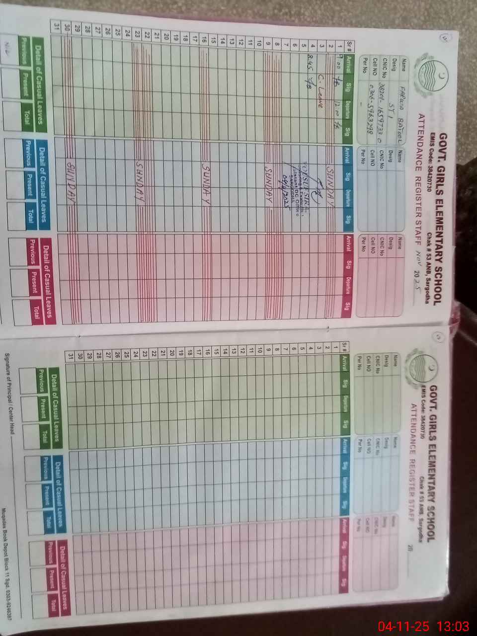 | CNIC | Full Name | Designation | R/C | Absence During Last Calender Month |