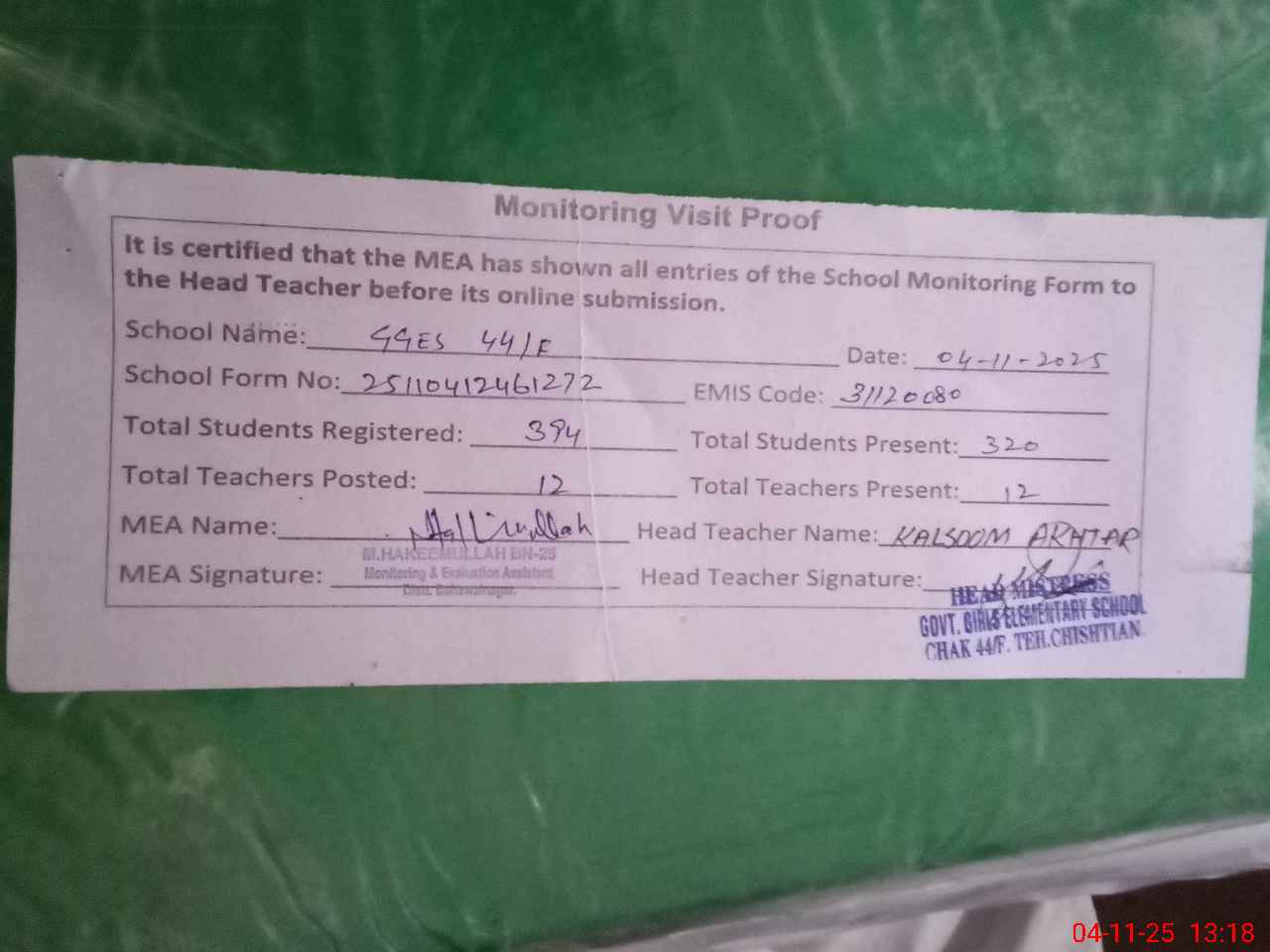 | Attendance Register | Head Teacher | MEA with School | Visit Proof |
