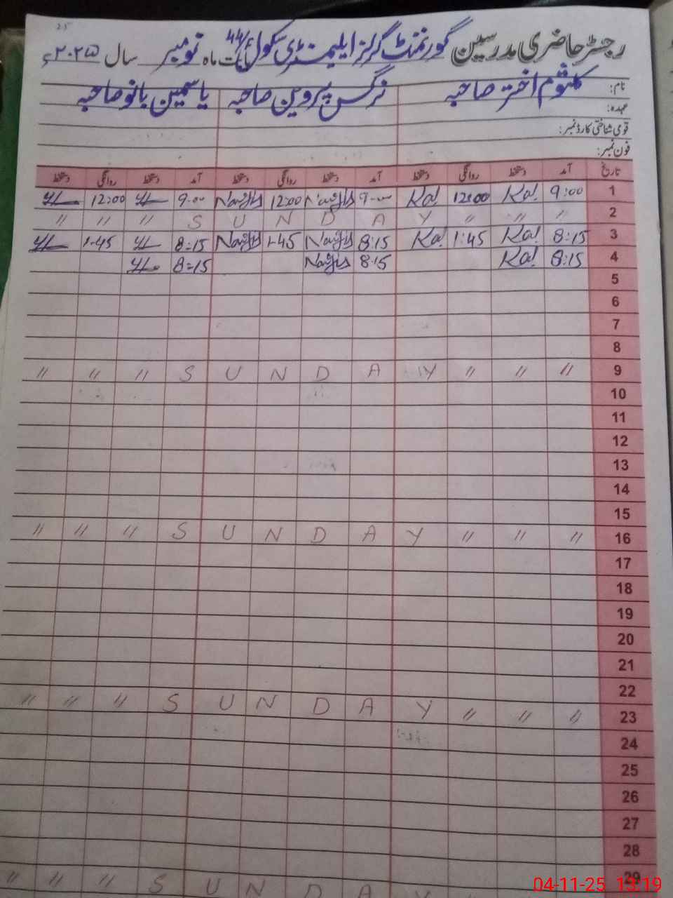 | CNIC | Full Name | Designation | R/C | Absence During Last Calender Month |