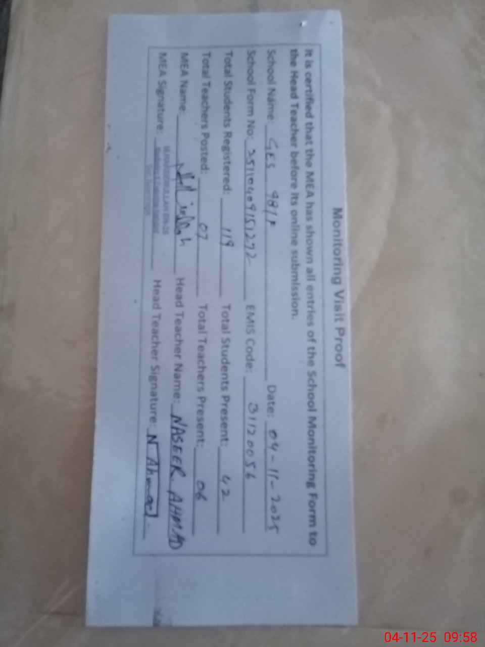 | Attendance Register | Head Teacher | MEA with School | Visit Proof |