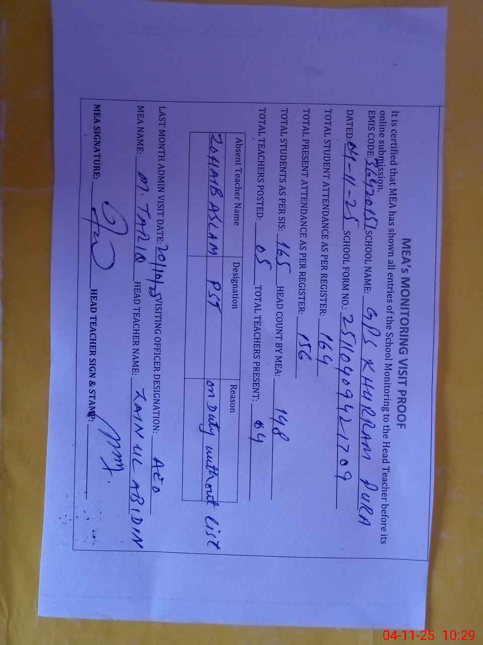 | Attendance Register | Head Teacher | MEA with School | Visit Proof |