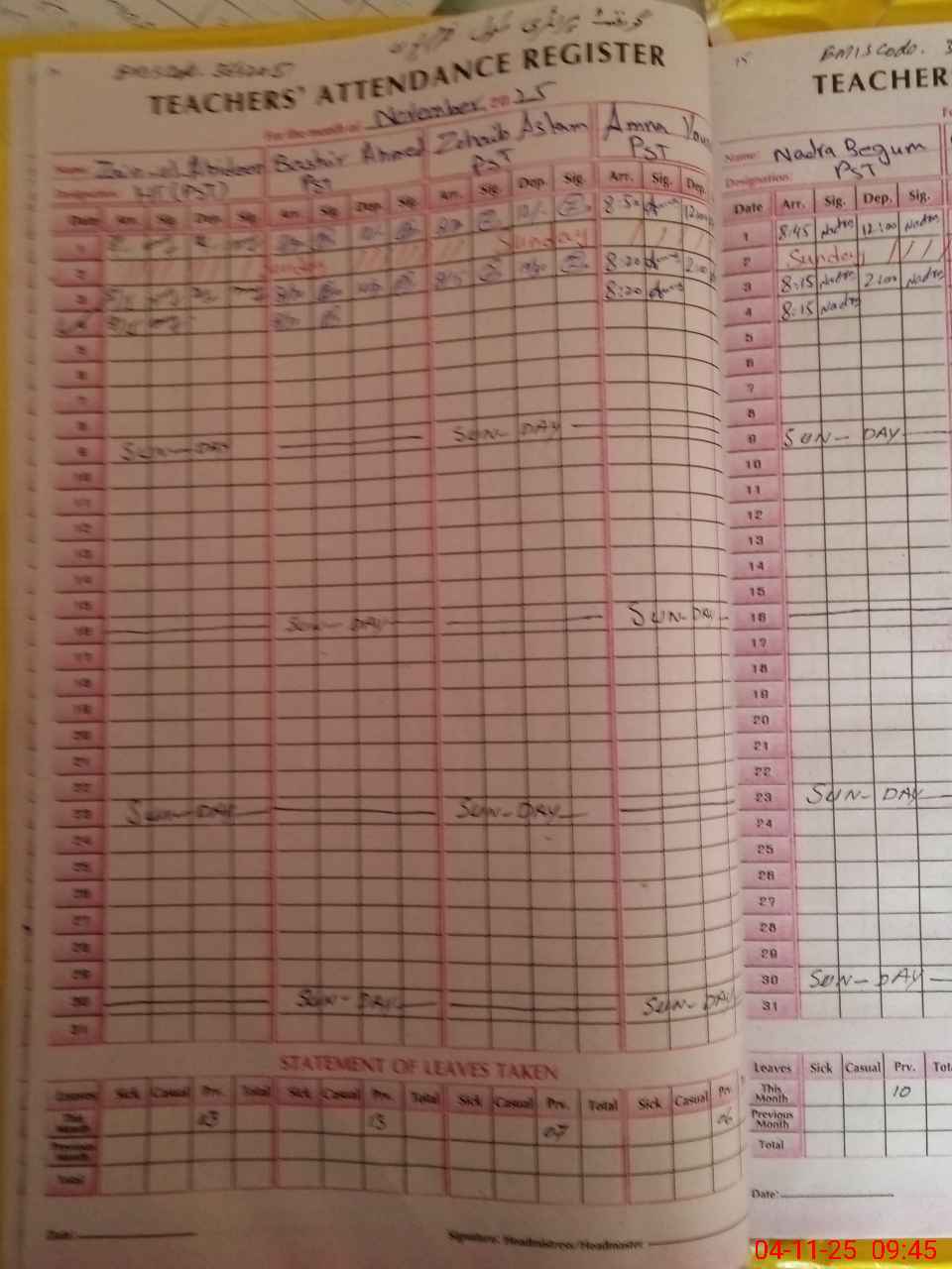 | CNIC | Full Name | Designation | R/C | Absence During Last Calender Month |