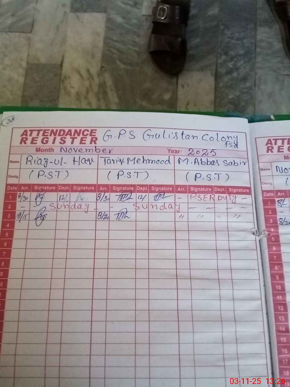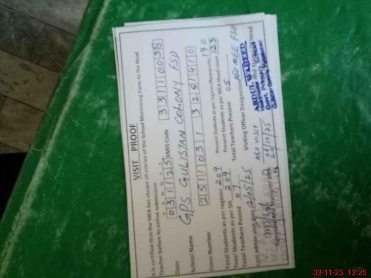 | EMIS Code: 33110038 | Name of School: GPS GULISTAN COLONY FSD | |||