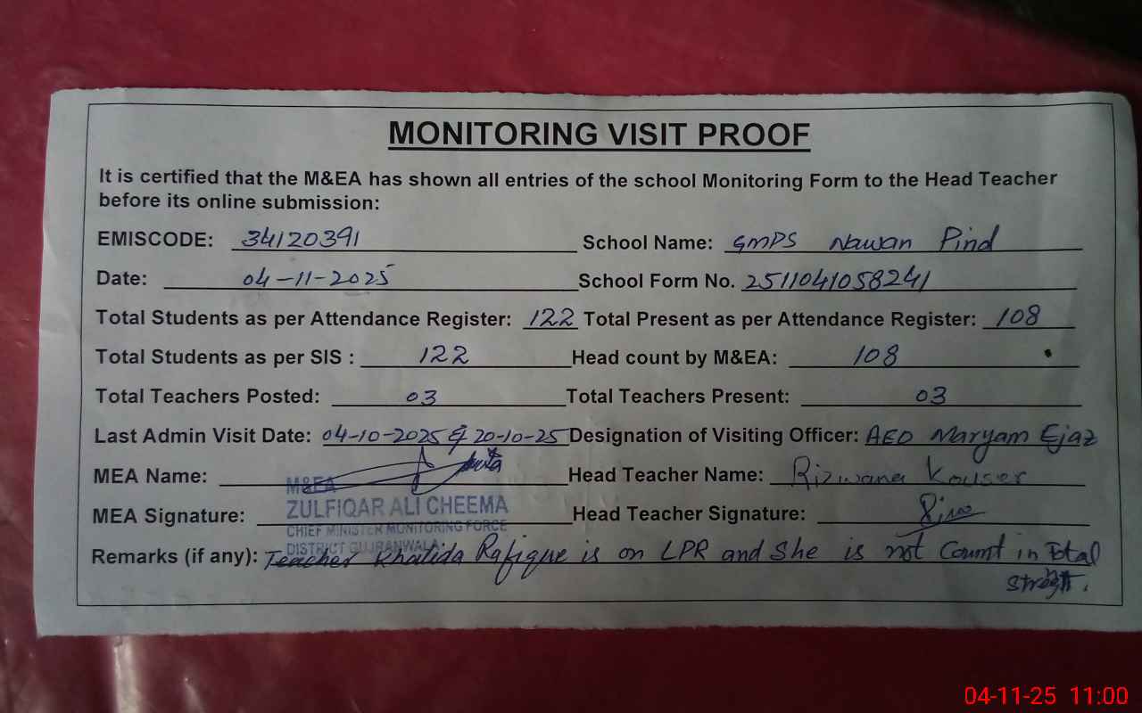 | EMIS Code: 34120391 | Name of School: GMPS NAWAN PIND | |||