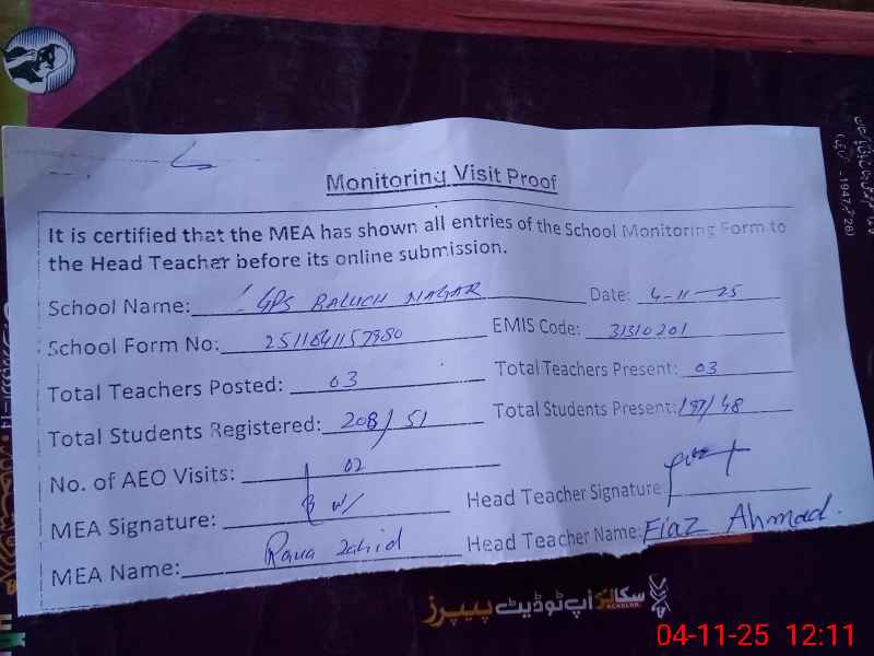 | EMIS Code: 31310201 | Name of School: GPS BALUCH NAGAR (After Noon) | |||