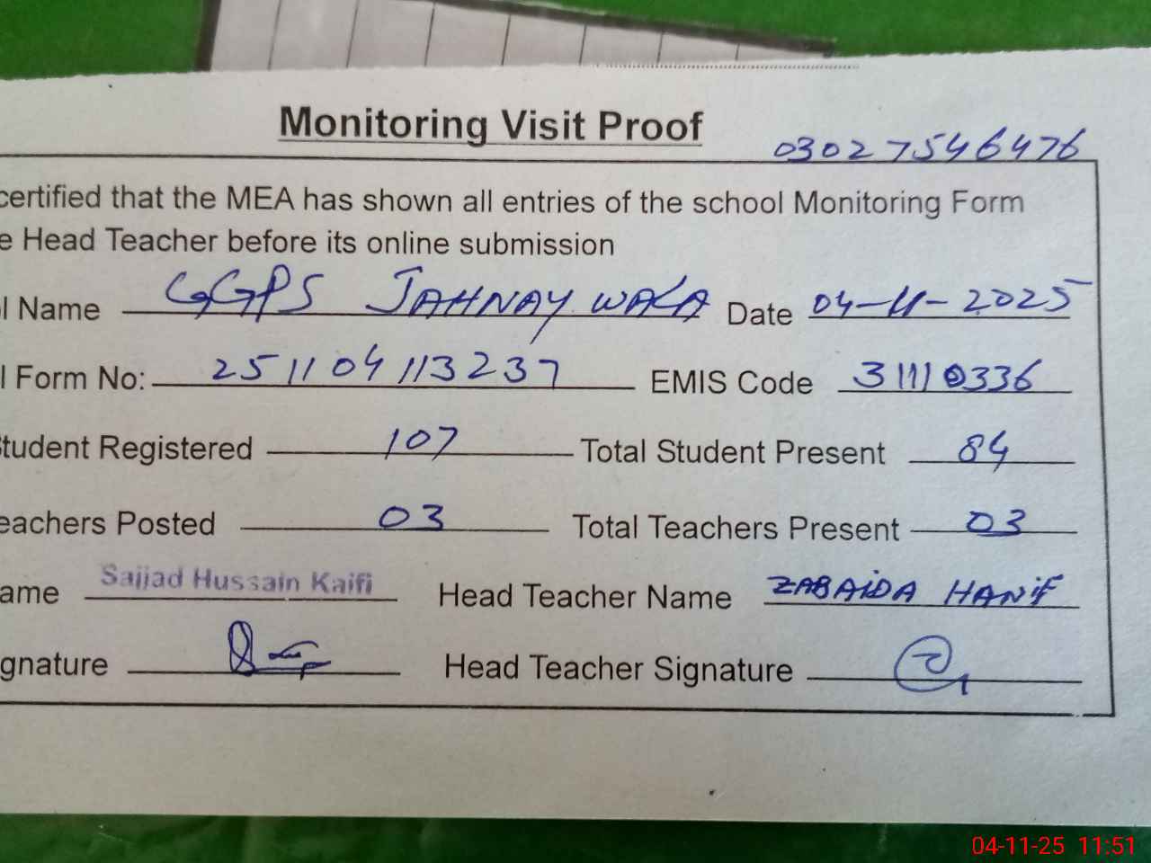 | EMIS Code: 31110336 | Name of School: GGPS JAHANAY WALA | |||
