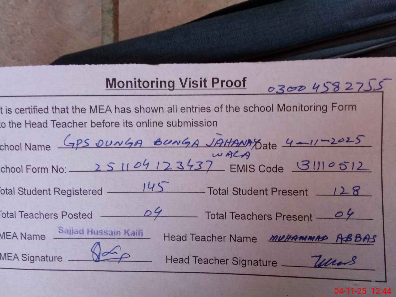 | EMIS Code: 31110512 | Name of School: GPS DUNGA BUNGA (JHANEY WALA) | |||